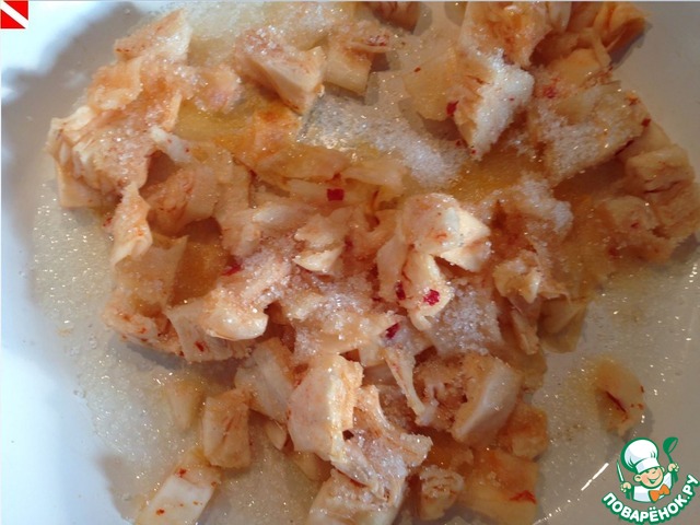 На сковороду наливаем половину растительного масла, выкладываем кимчи и сахар - обжариваем минут 5.