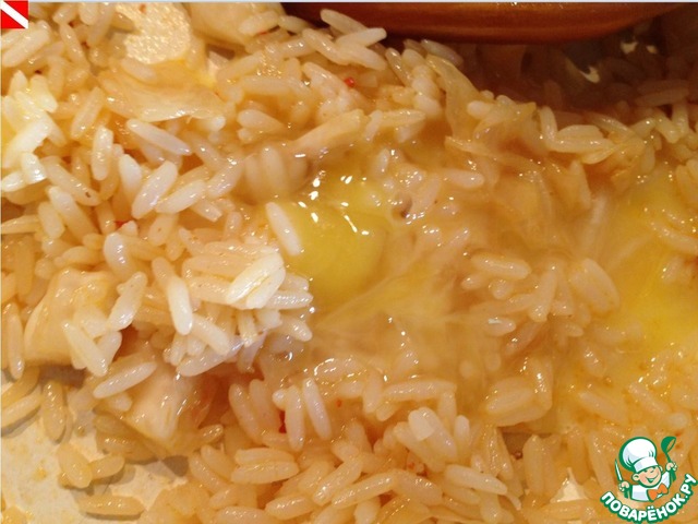 Второй вариант: яйца разбиваем в сковороду с рисом