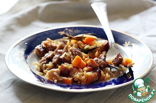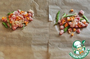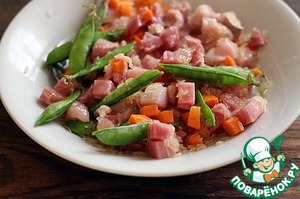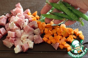 Мясо, в данном случае свинина (можно любое) и морковь нарезать мелким кубиком до 1 см. Горошек у меня очень молодой (заморозила вовремя) можно взять очищенный. В принципе овощи можно добавлять любые- кукурузу, перец и т. д.