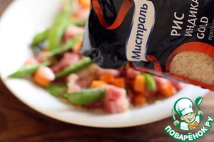 Смешать всё в глубокой тарелке, добавить масло, соль, перец, перемешать и добавить рис. Для этого рецепта мне очень понравился "индика голд" - шикарный рис.