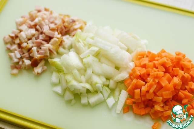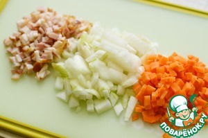 1. Лук, морковь и бекон нарезать мелким кубиком.