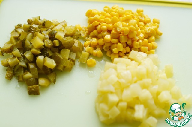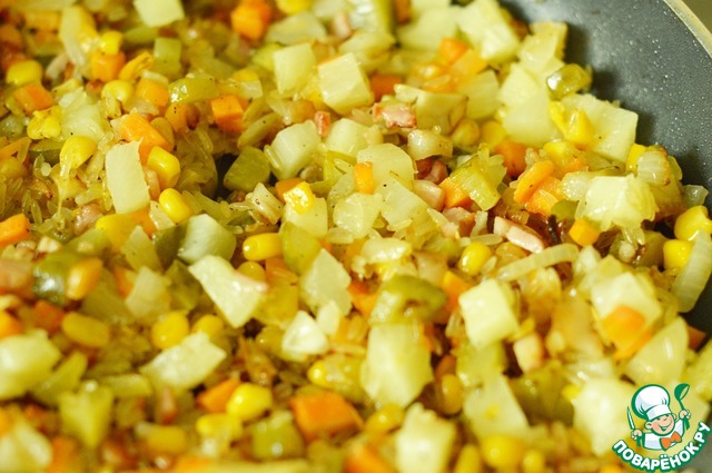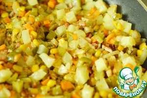 2. Огурец и ананас нарезать кубиком, с кукурузы слить жидкость. В сковороде обжарить бекон, затем добавить лук и морковь. Если нужно добавить еще кукурузное масло. Жарить минуту, затем добавить кукурузу и огурец, жарить еще минуту.