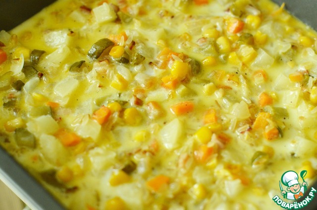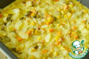 4. Затем добавить ананас, перемешать, посолить. поперчить. Выложить смесь в форму для запекания, залить кокосовым молоком.