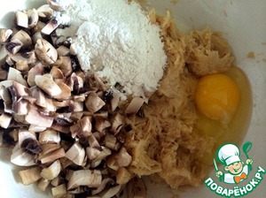 Смешиваем ингредиенты: картофель, сырые грибы, яйцо, немного муки. Добавляем приправы и специи по вкусу.