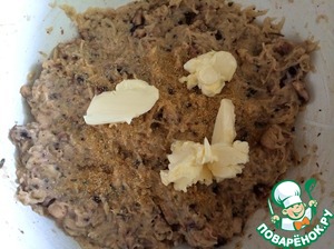 Для того, чтобы наша "булочка" была сочнее, добавим небольшой кусочек размягченного сливочного масла и тщательно размешаем ложкой так называемое "тесто".