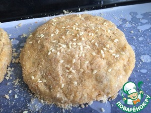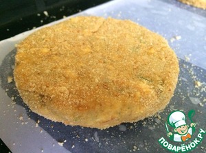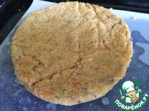 После прохождения картофельной массы по кляру и сухарям, будет совсем несложно придать ей нужную форму. На противень, застеленный пекарской бумагой, выкладывам картофельную массу, придавая ей форму. Итак, таким образом будет выглядеть нижняя часть булки для бургера: плоская.