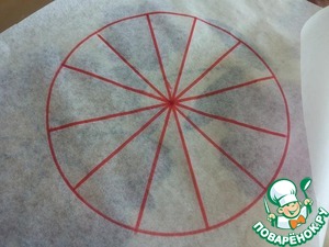 Нагреть духовку до 200 гр. Противень смазать жиром. На пергаменте начертить круг и разделить на 12 частей. Перевернуть бумагу и выложить на противень.