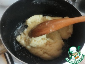 Дать немного покипеть, затем добавить сразу сразу всю муку и варить, помешивая, пока тесто не станет шаром, а на дне кастрюли не появится белая пленка.