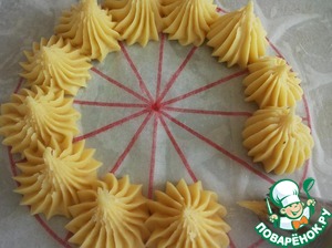 Выложить тесто в кондитерский мешок с большой звездообразной насадкой и выдавить тесто на противень в виде небольших розеток по размеченной окружности.