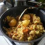 Причём сам умудрялся сотворить настоящее чудо из «запрещённой» для него свинины или постной курятины-говядины за полтора часа. Кстати, поиграем в «Жди меня», если кто-то знает этого человека (~1961г. р.) передайте ему: «Нойштрелиц 80», - он поймёт и пусть напишет сюда. Интересно будет списаться через 35 лет…. Так вот, от него я запомнил пару правил приготовления любого плова и с тех пор ими пользуюсь. Первое: сколько у Вас мяса, столько же должно быть морковки и чуть меньше лука. Точнее, это уже следующее, а первое - КАЗАН (плов в кастрюле не сваришь, а только кашу с мясом!!!) Второе: набор специй бывает праздничный и повседневный. Первый отличается наличием в нём барбариса и изюма. Однажды подобрав для себя набор специй, не меняйте его, т. к. сложно каждый раз вспоминать компоненты. Возьмите небольшую баночку (кофе 250 гр) и на базаре у знакомого восточного человека попросите сделать набор для повседневного плова. Если он всыплет барбарис, то его мама никогда не была на Востоке. Барбарис Вы должны взять у него отдельно и добавлять в плов вместе с изюмом при торжестве. Иначе у Вас получатся шашлыки с макаронами. А обычно в плов идут: зира, куркума, шафран, кориандр (семена), смесь жгучих красного и чёрного перцев, паприка и ароматные травы. Добавляйте свои любимые специи. Если Вы чего-то не переносите, смело вычёркивайте, кроме зиры и куркумы. Первая ускоряет переваривание и даёт вкус плову, вторая – антиоксидант и цвет плова. Запишите на баночке долю каждой специи и потом просто пополняйте её содержимое. Третье: обжаривание продуктов в плове происходит на большом огне, в достаточно разогретом масле, иначе лук и морковь «потеряются» в рисе. И четвёртое уже от себя: в плове нет каких-то ограничений по продуктам. Экспериментируйте, добавляя свои ингредиенты. В студенческие годы на мой плов «скидывались», и мы готовили его во дворе общаги в Одесском Водном. За двадцать лет работы в Дунайском пароходстве, на палубе своей баржи, доводя до энуреза помполитов, я кормил этим пловом своих друзей почти во всех портах, тогда ещё, до раздела, восьми придунайских стран. И при следующем заходе уже их жёны небезуспешно готовили нам свою разновидность этого блюда. И хотя Сталик Ханкишиев, доведись ему прочитать сей рецепт, предал бы меня анафеме, но я тоже с ним не всегда согласен. В конце концов, цель - ВКУСНОТИЩА, достигнута, а большего нам и не надо!!!