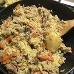 Куркума зачем? Если есть шафран, но и он не обязателен. Картошка однозначно лишняя, так как и так мало масла!!! Тем более куры всегда по определению сухие чем баранина или даже свинина.