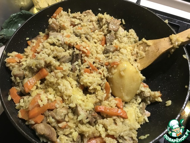 А вот этот шаг – моя ошибка. Картошка должна закладываться после готовности моркови, но я за это ещё поплачусь.… Кстати, предвидя возмущения, картошка в плове - это не извращение. Она забирает в себя лишний жир при выпаривании воды. Есть даже отдельное блюдо «Картошка палов», которое готовится без мяса, но как говорит Л. Каневский: - Это уже совсем другая история…