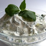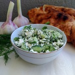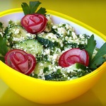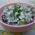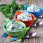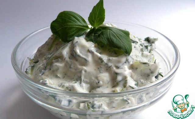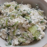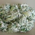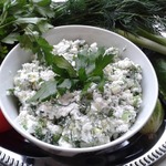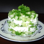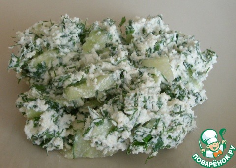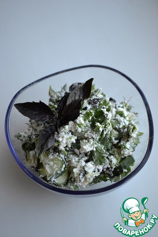 Добавляем нарезанные ингредиенты по очереди, смешивая каждый из них с заправкой из творога, в таком порядке: пряные травы (именно они в значительной степени определяют вкус салата), зелёный лук, огурец.