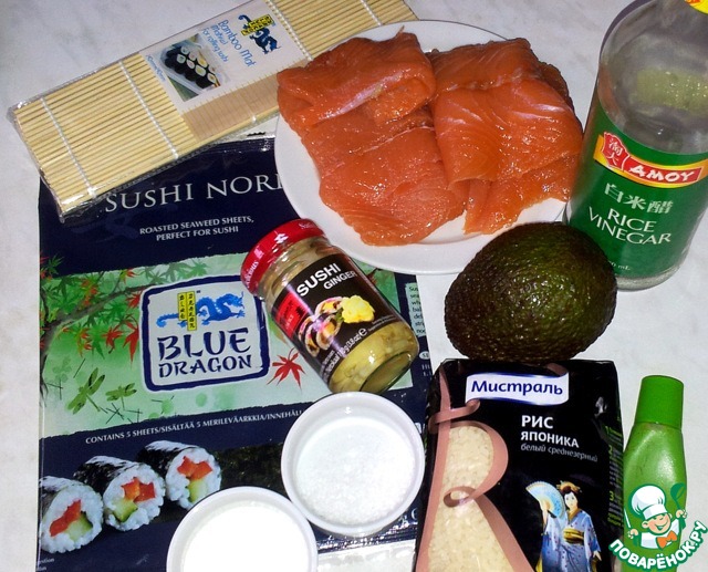Всё, что мне понадобилось для приготовления роллов - циновка, нори, филе лосося, рисовый уксус, авокадо, рис Мистраль "Японика", соль, сахар, имбирь, васаби.