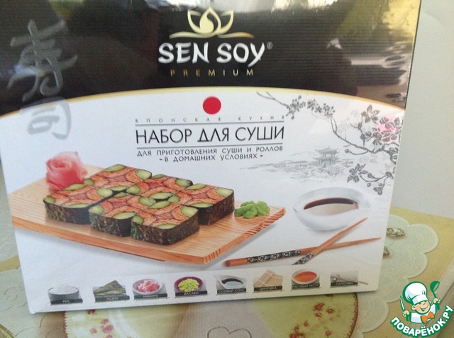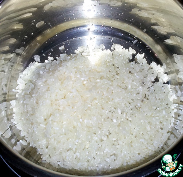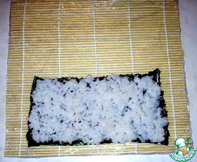 Циновку завернула в плёнку, чтобы она не пачкалась и дольше служила. Нори разрезала на две части и ровным, тонким слоем разложила тёплый рис. При выкладывание риса пальцы макала в раствор заранее приготовленный и разравнивала рис. Раствор - вода 1/3 стакана, 1 ст. л уксуса и 0,5 ч. л сахара. Рис накрыла свободным краем циновки и перевернула циновку, так чтобы рис оказался внизу, а нори сверху.