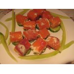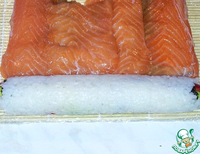 Свежий лосось немного посолила и чуть - чуть добавила сахар. Положила на нори в ряд брусочки очищенного авокадо, перца, кусочки лосося и при помощи циновки скрутила рулет. Рис получился сверху, а нори с начинкой внутри. Рулет положила с краю. Лосось нарезала, разложила перед рулетом и туго его скрутила вместе с лососем.
