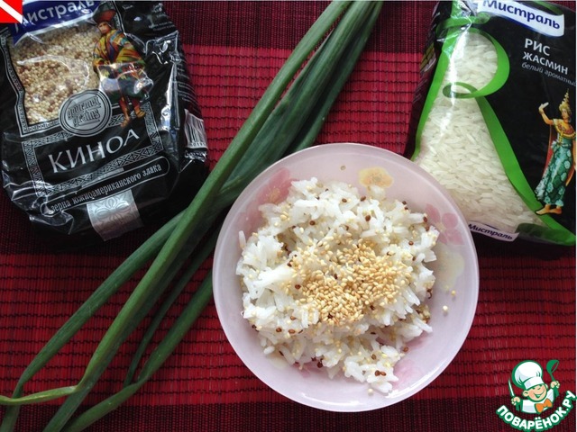 Приготовим рис (залить водой в соотношении 1:2, довести до кипения, накрыть крышкой, убавить огонь и варить 15 минут) и киноа (хорошо промыть холодной водой, залить в соотношении 1:2, довести до кипения, посолить, убавить огонь, варить 10 минут)