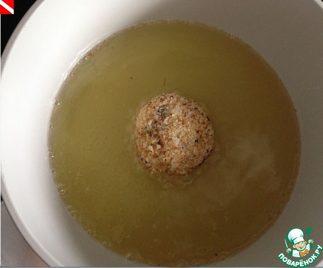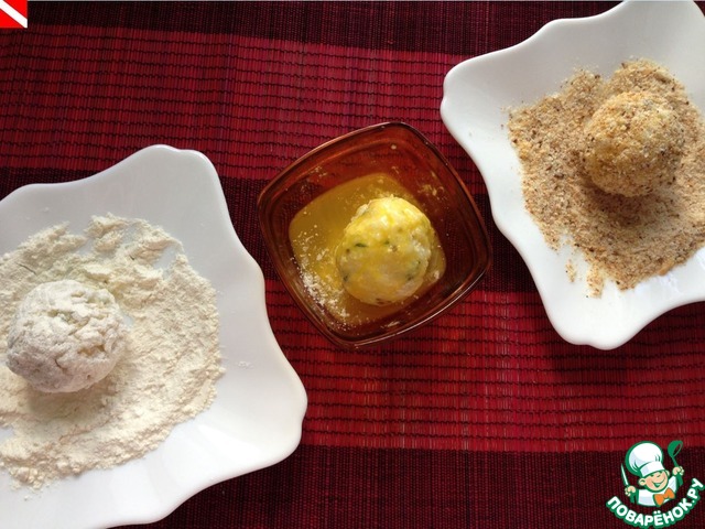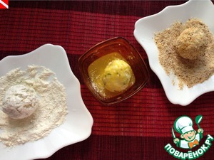 Каждый шарик обваливаем сначала в муке, затем в желтке, и в панировочных сухарях.