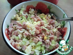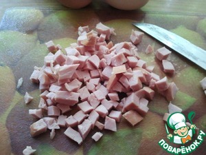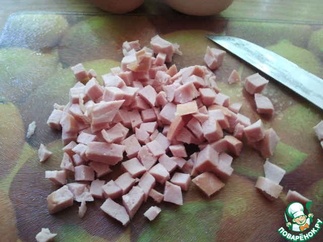 • Режем копченую колбаску, она даст легкий копченый привкус.