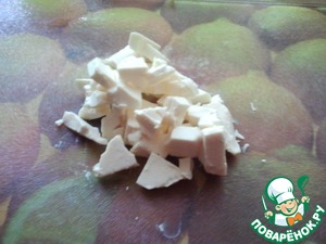 • Режем сырок. (У меня получилось совсем неаккуратно - сильно сливочный, берите твердый сырок).