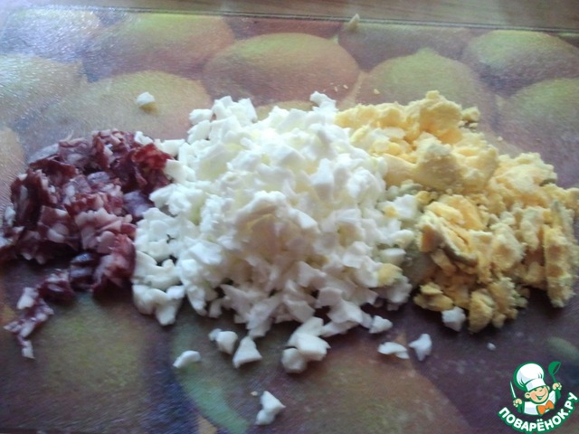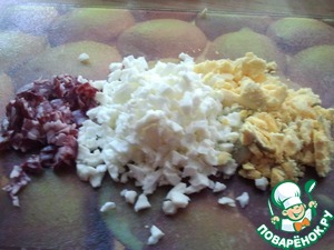 Яйца мелко крошим (растираем вилочкой или режем).