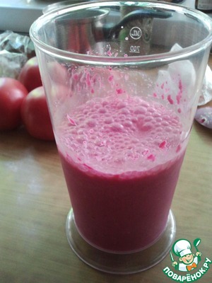 • В чашу блендера насыпаем свеклу, заливаем кефиром с бульоном 1:1. Хорошенько перебиваем.