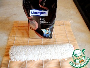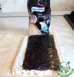 На коврик проложенный пищевой пленкой кладем ½ листа нори глянцевой стороной вниз. На него выкладываем готовый рис Японика ТМ «Мистраль» с нахлестом 1,5см.