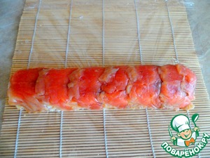 Выкладываем сверху слайсы кижуча и прижимаем ковриком.
