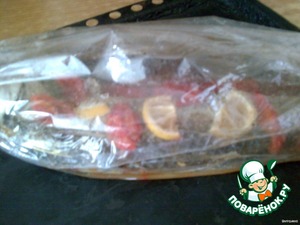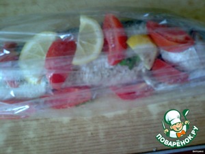 Поместить рыбу в рукав для запекания, сверху положить кусочки лимона и помидора, завязать рукав и в духовку на 30 минут.
