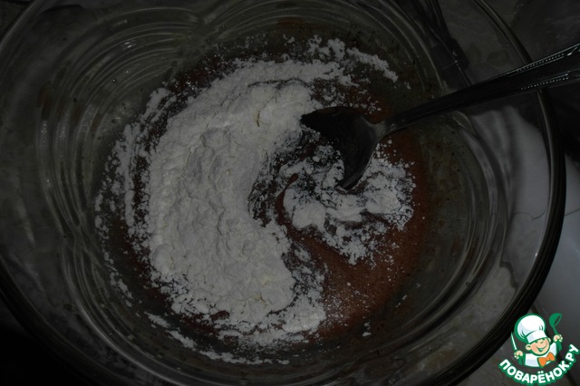 4. На малых оборотах миксера вводим немного остывший шоколад. Вмешиваем муку ложкой.