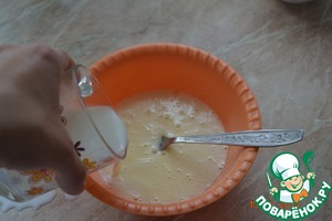 Полученную яично-молочную смесь потихоньку влить в сухую смесь и замесить тесто. Оно должно получиться эластичным. Если тесто липнет к рукам, то добавьте еще немного пшеничной муки.