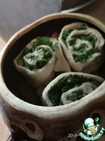 Тонко раскатываем тесто, смазываем его растительным маслом, присыпаем чесноком и зеленью. -