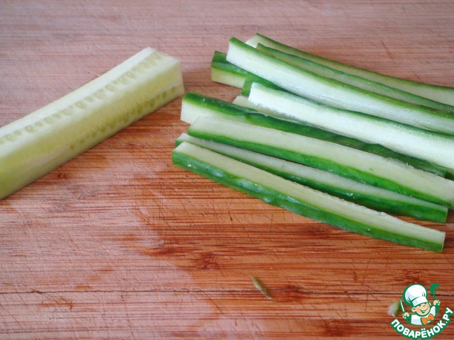 Подготовить ингредиенты для начинки. Огурец нарезать тонкой соломкой (без семян).