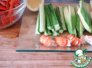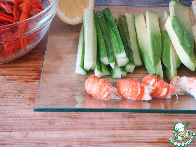 Выложить в середину полоски огурца, авокадо и раковые шейки.