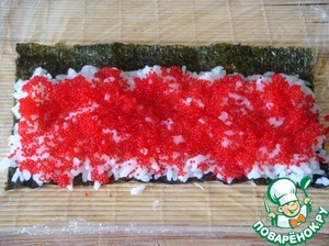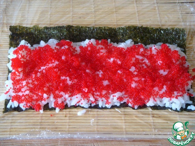 Выложить на циновку половинку листа нори гладкой стороной вниз. Смоченными руками распределить по шероховатой стороне нори рис, отступив около 1 см от края.