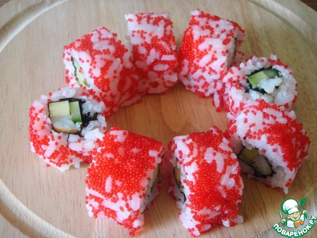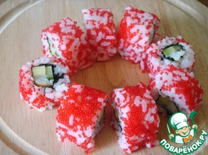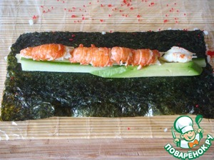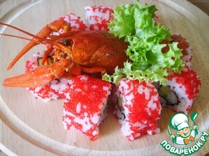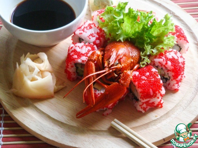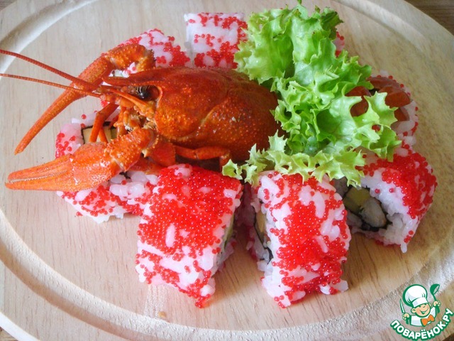 Сладковатое мясо раков замечательно вписывается в традиционный вкус суши, а выглядит это действительно эффектно!