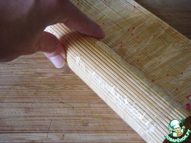 Помогая себе двумя руками, приподнять ближний край циновки вместе с нори и скатать вместе, придерживая начинку в середине, пока оба конца нори не встретятся. После этого свернуть весь ролл с помощью циновки и придать ему желаемую форму.