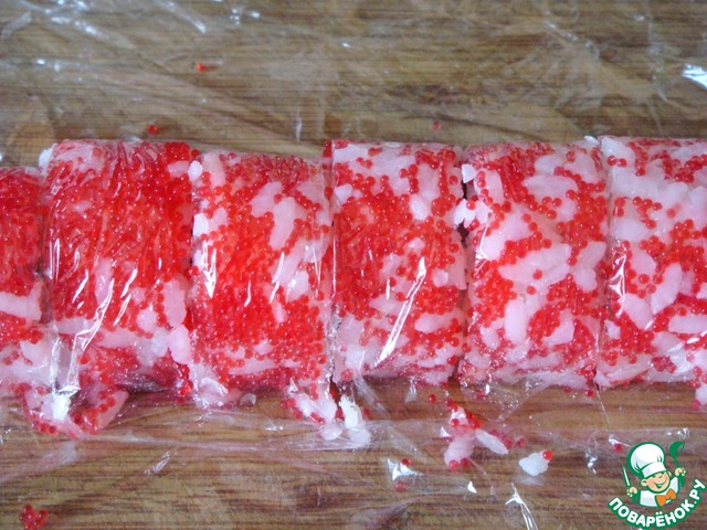 Готовый ролл перенести на разделочную доску, накрыть плотно пленкой и разрезать острым ножом на 6 или 8 частей, протирая нож и смачивая лезвие в подкисленной воде после каждого разреза. Пленку снять.
