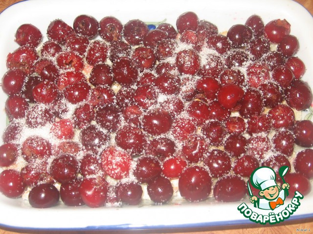 Вишни (косточки удалить) выложить на бисквит, посыпать 2 ст. ложками сахара.