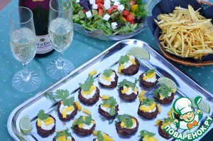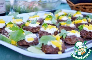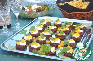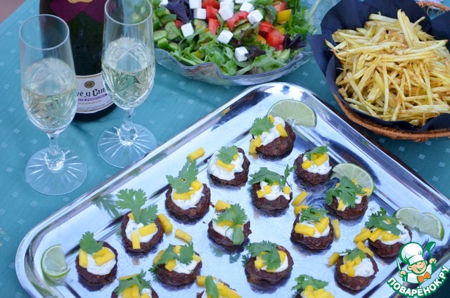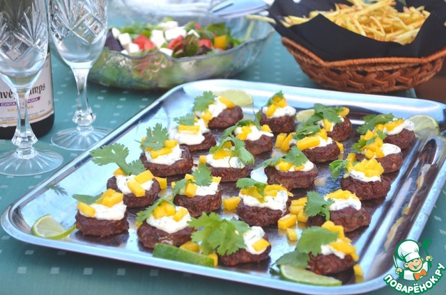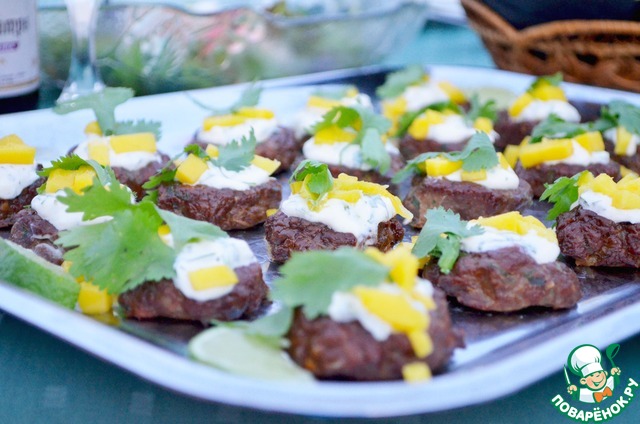 2. Для соуса: смешайте майонез, кориандр и сок лайма. Выложите по чайной ложке соуса на котлетки. Украсьте листьями кориандра и кусочками манго. Подавайте тёплыми или при комнатной температуре.