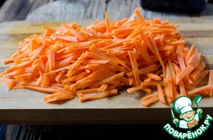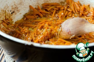 Влить в сковороду оставшиеся 2 ст. л. масла и высыпать морковь и лук, готовить около 8-10 минут, не забывая помешивать.