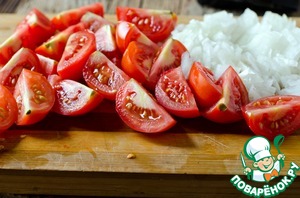 Лук очистить и мелко нарезать. Помидоры черри порезать на четвертинки.