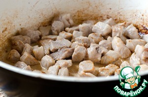 В разогретую сковороду влить 2 ст. л. растительного масла, затем добавить свинину и обжаривать его в течении 8-9 минут, не забывая периодически его мешать.