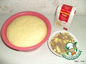 • Пока тесто подходит готовим начинку. Режeм мелко лук и обжариваем его на небольшом количестве масла минут 10. Затем добавляем туда фарш и еще обжариваем минут 10, солим и перчим по вкусу. Сырой картофель нарезаем небольшими дольками и перемешиваем с готовым фаршем. Начинка готова.