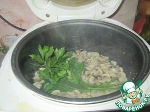 Грибы и картошку опустить в кипящую воду, варить в течении 10 минут, положить корень петрушки (в моем случае веточки петрушки), варить в течении 5 минут. Корень (веточки) петрушки вынуть.