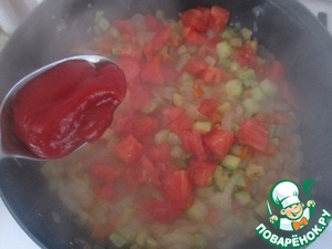Кабачки, лук и морковь обжарить в растительном масле на сковороде минут 10, затем влить немного воды, положить помидор, кетчуп и тушить в течении 3-5 минут.