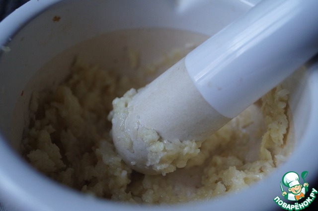 Чистим чеснок и измельчаем его с солью в ступке до пасты.