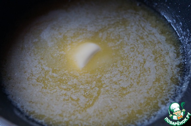 В сковороде топим сливочное масло, лучше взять топлёное, оно душистее. Вегетарианцы перекаливают растительное. Снимаем масло с огня и даём немного остыть.