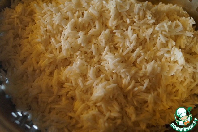Рис тщательно промываем до чистой воды и замачиваем на час-два в тёплой воде. Потом тщательно сливаем лишнюю воду через дуршлаг.