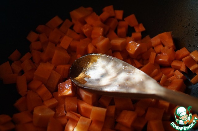 В казане или глубокой сковороде раскаляем растительное масло ( в идеале хлопковое или кунжутное). Закладываем морковь и обжариваем на сильном огне, постоянно помешивая, до готовности. Знатоки утверждают, что готовность моркови определяется по запаху: она начинает вкусно пахнуть.